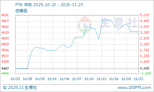 本周国内PTA市场行情小幅回落,截止11月23日国内华东地区PTA现货价格在4622元/吨,较周初下跌0.53%。印度BIS放开认证,叠加PTA部分装置因故提前检修,改善供应结构且预期带动出口增速,但受终端需求压制,价格偏弱调整。