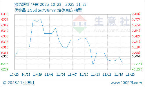 据生意社商品行情分析系统,本周(11月17-23日)国内涤纶短纤价格震荡下跌,截止11月23日涤纶短纤(1.4D*38mm)市场均价在6297元/吨,较周初下跌0.06%。