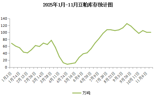 库存方面:下半年开始,豆粕库存持续走高。6月大幅增加,7月豆粕库存居高不下,8月更是突破100万吨。9月豆粕库存持续110万吨以上,中旬更是高达120多万吨。十一过后,库存数量下滑,重回100万吨以下。11月,豆粕库存依旧处于100万吨左右。库存压力持续存在,豆粕行情反弹乏力。