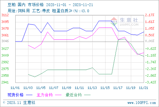 据生意社商品行情分析系统:11月以来,多空因素交织,豆粕行情高位震荡。11月1日,豆粕市场均价3046元/吨,11月21日,豆粕市场均价3070元/吨,周期内价格上涨0.79%。
