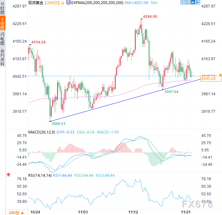从技术面看,现货黄金目前成功守住了自10月下旬延伸的上行趋势线。该支撑位目前锚定在4030美元附近,并与4小时图上的200周期指数移动平均线(EMA,4031)形成关键技术共振。这一交汇区域将成为重要多空分水岭——若有效跌破,金价或将进一步跌穿4000美元心理关口,下行轨迹可能延续至3931美元支撑位,进而挑战3900美元关口及10月末波动低点3886附近。