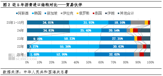 2021年以来中国沥青进口量维持低位,但是2023-2025年同期进口量连续小幅反弹,且进口沥青主要来源地发生显著变化,中国从韩国、新加坡等东亚、东南亚国家进口沥青占比持续下降,从中东国家进口沥青占比不断上升。