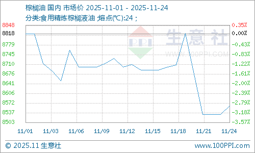 据生意社商品行情分析系统显示:11月1日开始,国内棕榈油行情振荡下行。11月1日,棕榈油市场均价8818元/吨,11月24日,棕榈油市场均价8562元/吨,价格下跌2.9%。