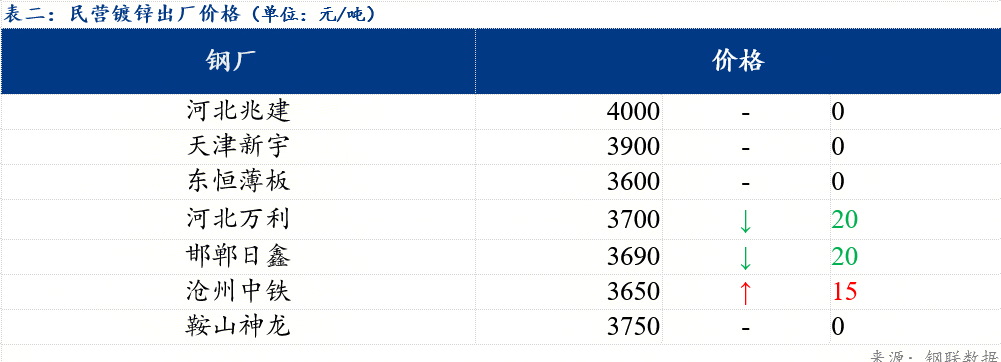 今日北方民营钢厂镀锌出厂指导价在3600-4000元/吨。