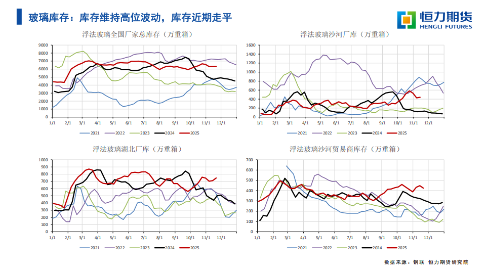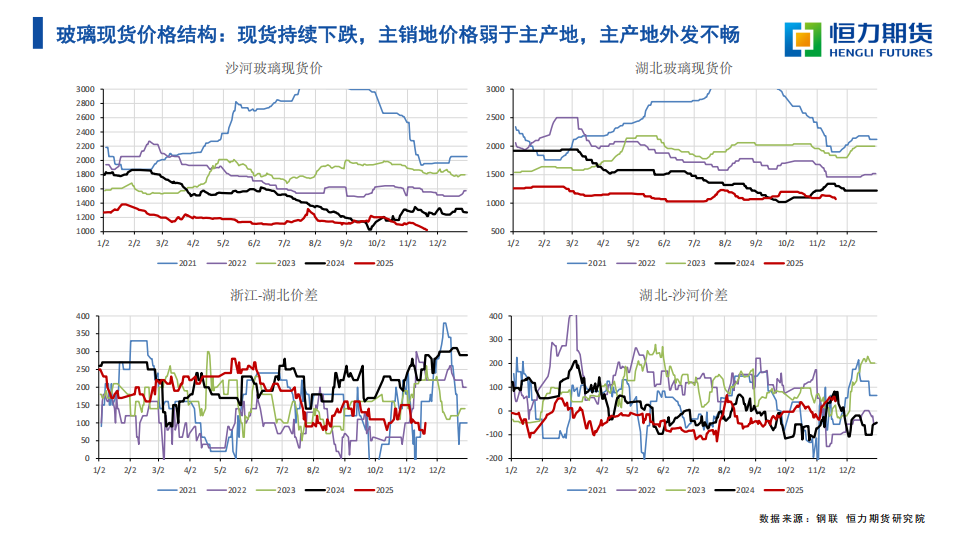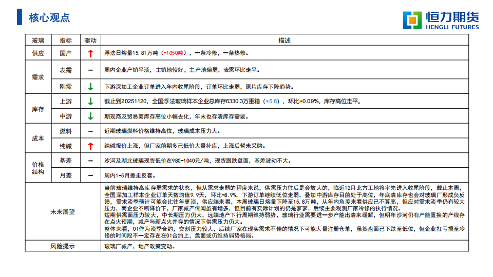 短期供需面压力较大,中长期压力仍大,远端地产下行周期维持弱势,玻璃行业需要进一步产能出清来缓解,但明年沙河仍有产能置换的产线存在点火预期,减产与新点火并存的情况下供需压力仍大。