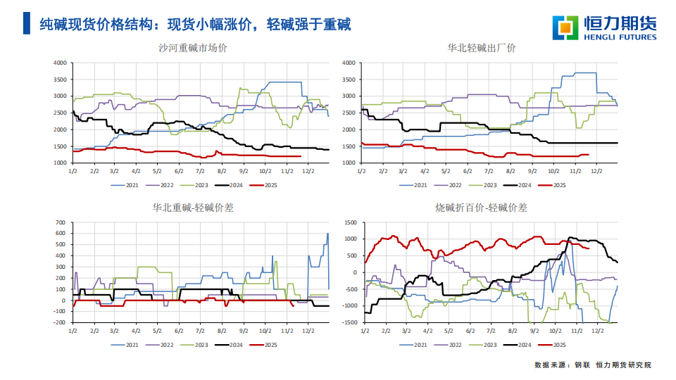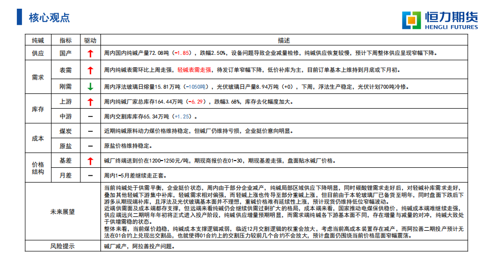 当前纯碱处于供需平衡,企业挺价状态,周内由于部分企业减产,纯碱局部区域供应下降明显,同时碳酸锂需求走好后,对轻碱补库需求走好,叠加其他轻碱下游集中补库,轻碱需求相对偏强,而轻碱上涨也传导至部分重碱上涨,但目前由于本轮玻璃厂已备货至明年,同时盘面下跌后下游多从期现端补库,且浮法及光伏玻璃基本面并不理想,重碱价格难有延续性上涨,预计现货仍维持低位窄幅波动。