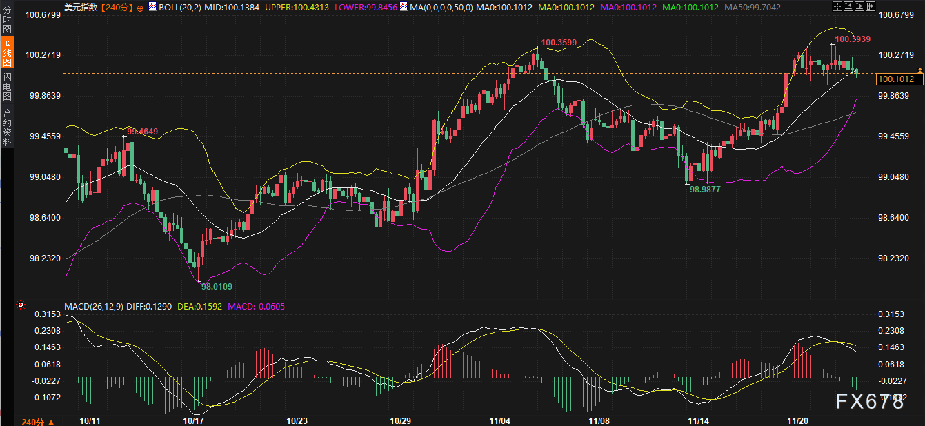 汇通财经APP讯——周一,美元指数窄幅震荡于100.10附近,日内微跌0.09%,延续上周五的疲软态势。同期,10年期美债收益率回落至4.05%,较前日下跌4.7个基点,触及布林带下轨支撑。市场交投清淡,日本因劳动感恩节休市加剧流动性短缺,美国国债期货成交量萎缩,12月合约仅成交41万手,波动区间收窄至113-05.5/113-10.5。这一格局显示,投资者在货币政策信号不明朗与全球债市波动加剧的背景下趋于谨慎。