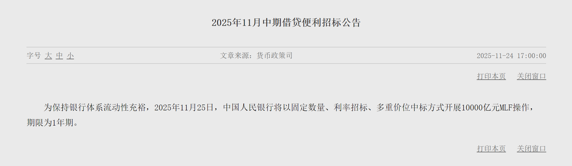 央广网北京11月24日消息(记者 冯方)11月24日,央行发布公告称,为保持银行体系流动性充裕,央行将于11月25日以固定数量、利率招标、多重价位中标方式开展10000亿元中期借贷便利(MLF)操作,期限为1年期。