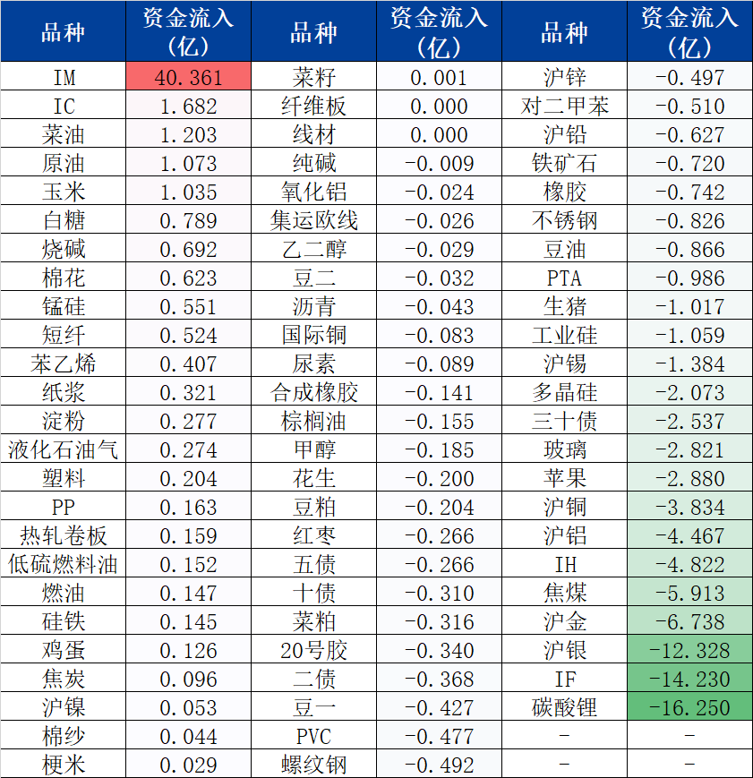 资金流入前三名为IM、IC和菜油;流出前三名分别为碳酸锂、IF和沪银。