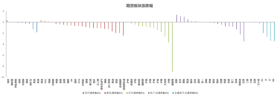 从板块整体表现看,农产品部分上涨,有色、股指下跌。
