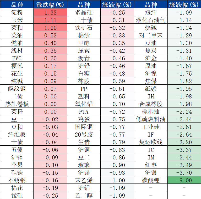 涨幅居前的三个品种分别是淀粉、玉米和菜粕;跌幅居前的是碳酸锂、沪银和红枣。