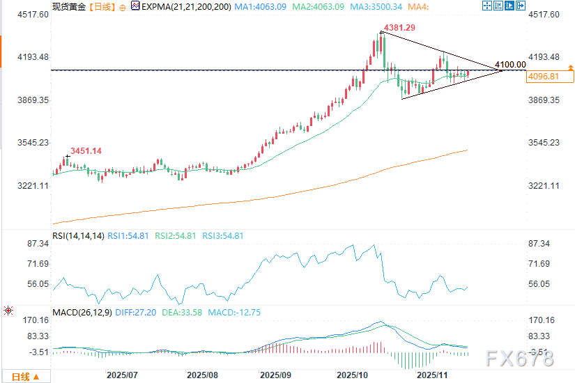 汇通财经APP讯——周一(11月24日)美盘时段,当前黄金日内走势呈现尾盘强势拉升、多头动能占优的状态。黄金价格盘中上涨0.81%,但缺乏实质动能支撑,能否实现更具意义的反弹仍有待观察。近期该贵金属持续横盘整理,在4000美元至4100美元区间内窄幅波动,区间振幅仅100美元。日线收盘价始终徘徊在该区间中上部区域,而较长的上下影线形态表明,多空双方均未形成主导市场的坚定信心。随着美元走势趋强、股市震荡波动、债券市场承压以及加密货币市场同样起伏不定,黄金展望仍受制于相互冲突的市场逆流。