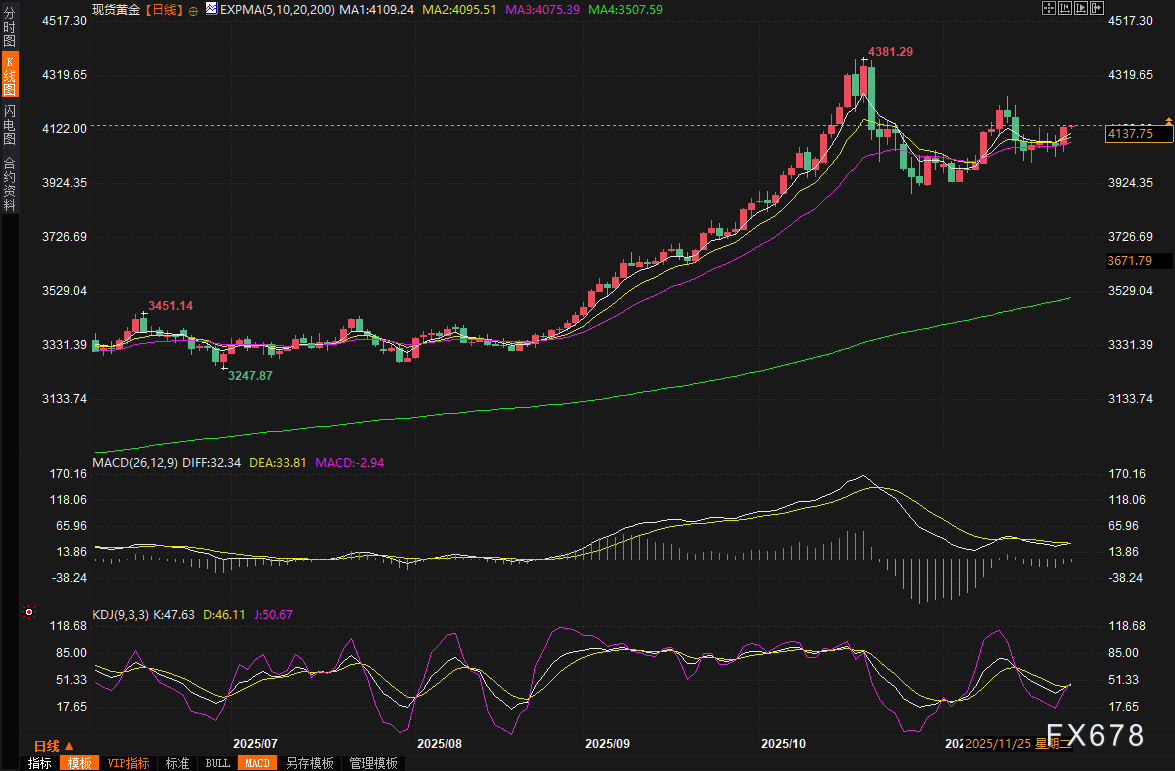 汇通财经APP讯——周一(11月24日),现货黄金强势收在4134.54美元/盎司,单日大涨1.7%,创近两周最大单日涨幅,成功站稳4100美元心理关口。美联储内部“鸽声四起”,12月降息概率从上周的40%一路飙升至81%,市场对宽松预期的重新定价成为本轮金价暴拉的绝对主线。与此同时,俄乌局势再生波澜,基辅紧急拉响防空警报,地缘风险再度为黄金提供避险溢价。双重利好共振之下,黄金多头“卷土重来”!周二(11月25日)亚市早盘,现货黄金守住涨幅,目前交投于4140美元/盎司附近。