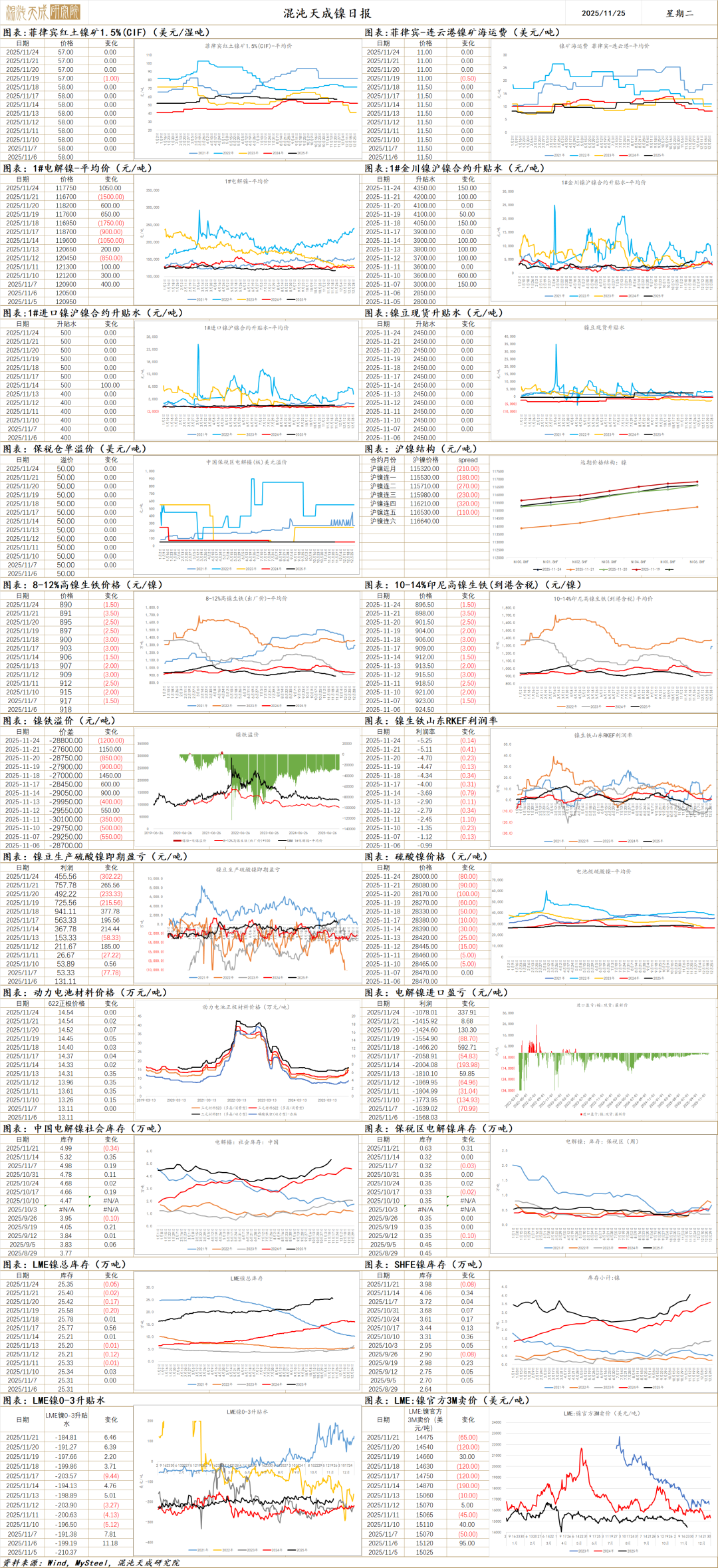 2、【印尼QMB镍厂因环保安全问题削减产能】多位知情人士透露,由中国格林美(GEM)牵头的印尼镍钴合资企业QMB新能源材料公司(QMB NewEnergy Materials),在安全检查发现其矿石废料储存存在问题后,已削减至少一半产能。这家合资企业位于苏拉威西岛的印尼莫罗瓦利工业园区(IMIP),主要从事镍矿石加工,生产镍钴氢氧化物(MHP)。印尼环境部已对多家金属工厂展开检查,以确保这些企业安全处理被称为“尾矿”的矿石废料。其中一位知情人士表示,此次产能削减可能导致12月镍当量产量减少6000公吨,并补充称产量下降将持续至2026年第一季度。路透社另一位消息人士则指出,受影响的产量规模在12月可能进一步扩大。根据持股63%的母公司格林美(GEM)官网信息,QMB的年产能为9.6万公吨镍当量,即月产能8000公吨。QMB是印尼首批采用高压酸浸(HPAL)工艺的镍钴工厂之一,于2022年正式投产。(要钢网)