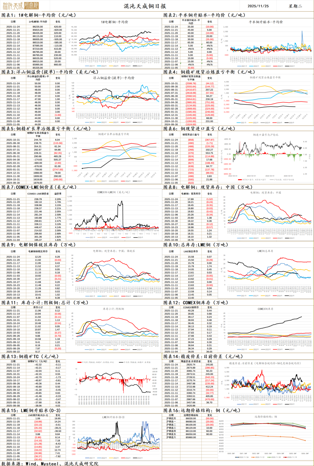 供给端,冶炼环境仍较差,部分冶炼厂仍面临亏损状态,含硫酸的冶炼利润再次转弱,铜冶炼厂检修高峰,10月和11月电解铜产量偏低。需求端,全球显性库存开始出现回升,LME开始累库,Comex库存高位震荡;截止到11月20日国内市场电解铜现货库存19.21万吨,较13日降0.59万吨,较17日降0.24万吨;下游企业逢低采购,但整体备货情绪相对有限,进口铜到货相对较少 ,库存小幅下降,但供应压力尚未明显出现。伴随着不确定的宏观环境,终端消费需求仍存在一定的不确定性。