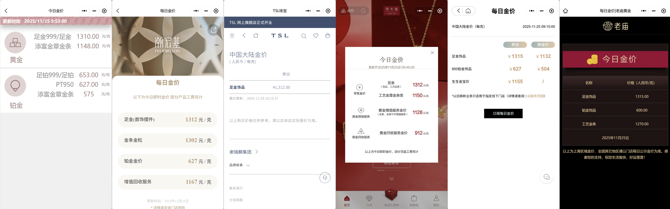 上证报中国证券网讯(记者 曾庆怡)11月25日,多家黄金珠宝品牌公布的境内足金饰品价格升至1315元/克左右。