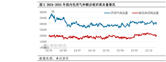 醚后碳四方面,国际方面,11月国际原油呈现偏弱震荡格局。中美和谈顺利,美国政府停摆结束有望,支撑油价,但欧佩克月报公布,供应增加和需求弱化同时利空原油市场,拖累油价小幅下跌,国际原油给予市场利好支撑有限。国内方面,上旬北方市场供应存缩减预期,而下游烷基化装置开工负荷率上升,市场价格一度出现宽幅上涨。但随着价格上涨,烷基化油装置利润亏损加剧,同时油品市场需求偏弱牵制,企业开工负荷率下降,醚后碳四刚性需求减少,拖累后期价格回调。除山东地区外,国内多数地区民用和醚后价差呈现倒挂,部分单位醚后混入民用中销售,侧面加大民用气销售压力