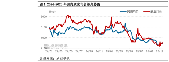 进入11月,国内民用气和醚后碳四市场均呈现涨后盘整态势。国内液化气市场运行以供需关系为核心驱动力,同时受国际环境的辅助影响,价格波动呈现明显的市场特征。国内市场供应端缩减给予市场短暂支撑,但需求端疲软限制市场走势。预计12月国内液化气市场将延续供需博弈格局,预计价格走势维持僵持盘整态势。