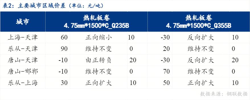 从区域价差来看,4.75mm普卷华南与华北价差90元/吨,华东与华北价差60元/吨,华南与华东价差30元/吨。京津冀地区价差来看,唐山与天津价差-10元/吨,唐山与邯郸价差-10元/吨。