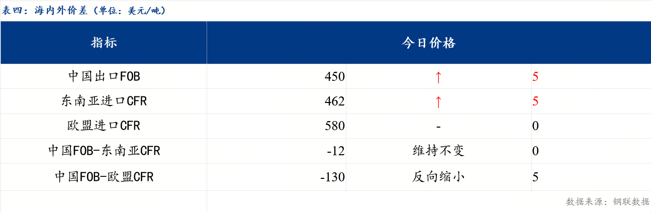 从海内外价差情况来看,中国热卷出口在450美元/吨,较上一交易日上涨5美元/吨;欧盟进口价格580美元/吨,较上一交易日稳。