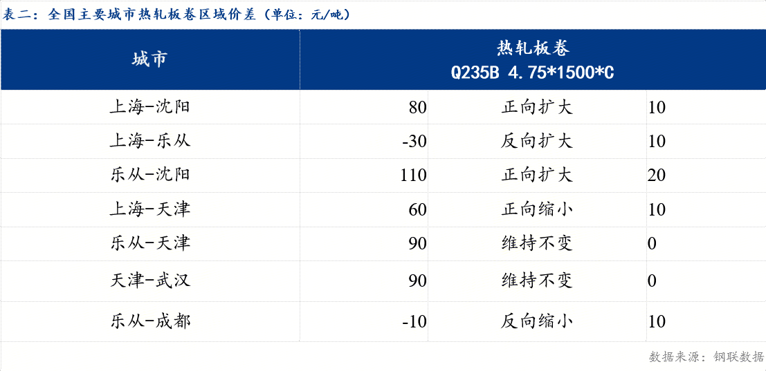 从品种价差来看,卷螺差较上一交易日正向缩小5元/吨,热中价差较上一交易日反向缩小5元/吨,热带价差较上一交易日正向缩小4元/吨 ,热冷价差较上一交易日反向缩小5元/吨。