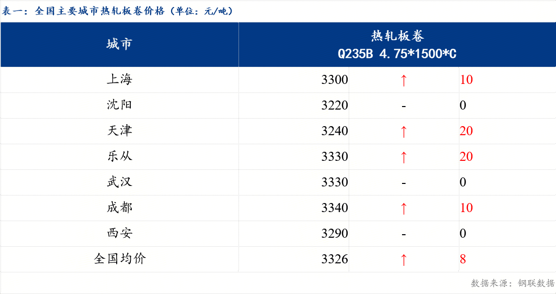 今日热轧板卷全国主要城市价格小幅上涨,成交不佳。截止发稿时4.75热轧板卷全国均价3326元/吨,较上一交易日上涨8元/吨。黑色系期货价格震荡趋强运行,热卷01合约收涨0.64%,市场情绪小幅升温。