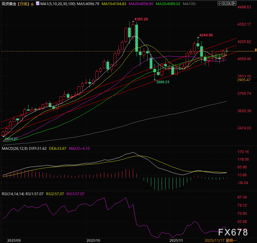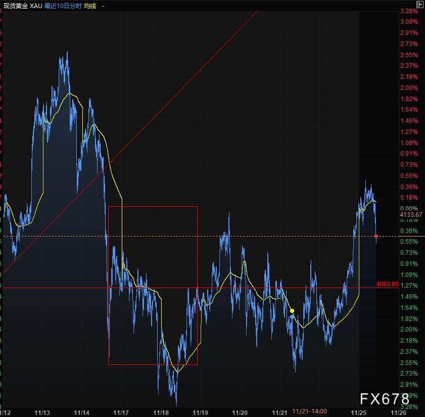 汇通财经APP讯——周二(11月25日)亚欧时段,现货黄金呈现小幅冲高回落加探底回升走势。日内黄金虽小幅上探逾一周高点涨0.6%左右,但未能有效承接涨势,上行延续性不足,盘中一度跌至-0.6%,目前跌幅收窄至-0.2%交投于4125美元附近。