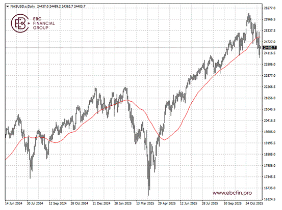 纳斯达克100指数持续远低于50日均线,没有显示什么反转迹象。预计该指数将在12月底前再度跌破24400点关口。