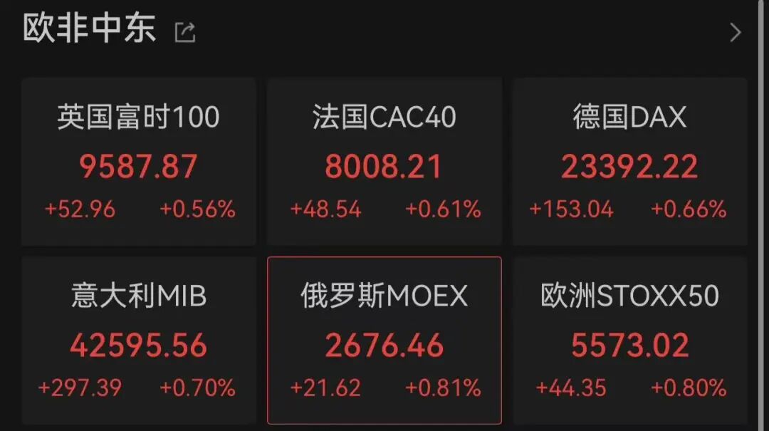 欧洲股市集体上涨,英国富时100指数涨0.56%,法国CAC40指数涨0.61%,德国DAX30指数涨0.66%。