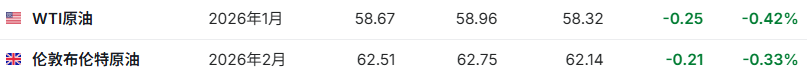3. 截至发稿,WTI原油跌0.42%,报58.67美元/桶。布伦特原油跌0.33%,报62.51美元/桶。