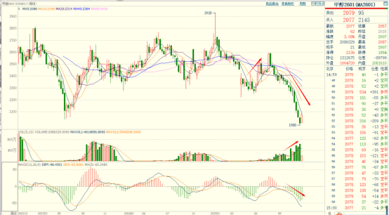 本周甲醇2601合约价格加速下跌,盘中跌破2000整数关口,价格已经是近几年新低,均线空头排列,成交量持续增加,持仓量小幅减少。