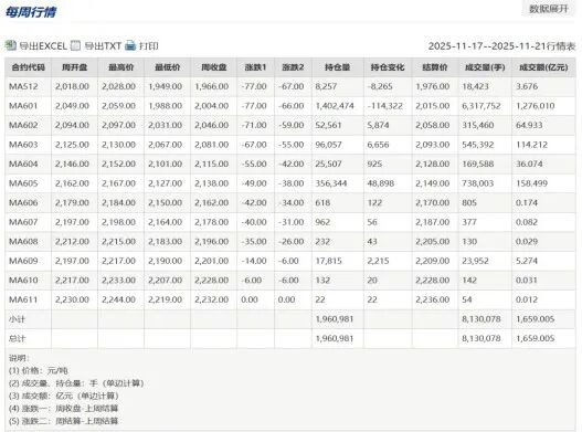 上周(20251117-1121)甲醇2601合约(MA2601)收盘价2004元/吨,开盘价2049元/吨,最高价2059元/吨,最低价1988元/吨,本周跌幅2.48%,成交量631.77万手,持仓量140.24万手。