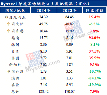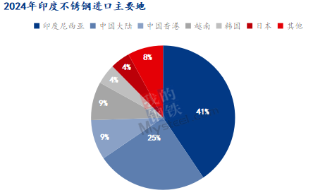 印度海关数据由Mysteel整理发现,2024年印度不锈钢进口主要地为印尼和中国大陆,其中自印尼进口的量约74.39万吨(81%的为钢坯)占比高达41%,自中国大陆进口的量约45.75万吨(82.4%的为宽度≥600mm的卷板)占比约25%。