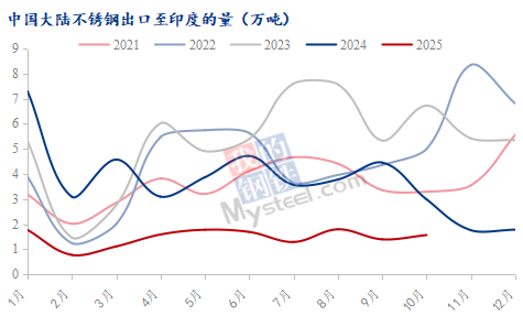 2025年1-10月,国内不锈钢出口印度的量约14.74万吨(约占国内不锈钢出口总量的3.6%),同比减少26.7万吨,减幅64.4%。