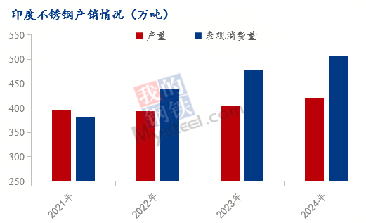 据Mysteel统计,印度不锈钢产量也是逐年稳步提升,2024年印度不锈钢产量达421万吨,同比增加15.7万吨,增幅3.9%;不考虑库存因素,印度不锈钢表观消费量达506万吨,同比增加27.2万吨,增幅5.7%。