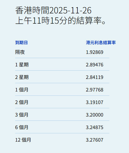 11月26日,港元拆息全面上升,隔夜息报1.92869%,升55.762基点;一周拆息升23.678基点,报2.89476%,两周则升20.726基点,报2.84119%。与楼按相关的一个月拆息连升5日,报2.97768%,升16.399基点。
