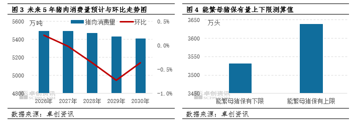 按照出生人口数量测算国内人口总数,以及结合城镇化和农村化的占比推算,同时根据城镇和农村人均猪肉消费量的变化关系,推算2026-2035年猪肉消费总量预计在5320万吨-5490万吨区间内震荡下滑。而结合年供需差在350万吨左右,依照当前规模化产能占比,全行业平均MSY、PSY和卓创资讯监测交易均重数据推算,能繁母猪保有量合理区间或在3531.22万-3638.23万头。未来行业将通过控产、提效、创新和促绿色发展,促进生猪行业转型的同时,推动减产进一步进行,未来能繁母猪保有量有望进一步下降至合理范围内,推动现代化生猪产业新格局形成。