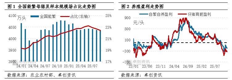 一方面从宏观角度分析,产能过剩形势明显,而人口年龄结构调整与人口基数下滑,导致消费端存在持续减量预期,增产与减量并存,市场进入过剩出清阶段。从微观视角看,产能过剩导致生猪价格持续低位运行,育肥头均盈利已经甚至大幅缩减,反映供需结构性矛盾。据卓创资讯监测数据显示,自繁自养盈利与仔猪育肥盈利自9月中旬和7月下旬后转亏,截至11月21日,自繁自养盈利为-186.61元/头,仔猪育肥盈利在305.49元/头。且仔猪外卖亦处于亏损状态,当前头均亏损50-100元,对于养殖企业而言,产能过剩或导致至少2026年养殖全行业或持续处于亏损状态且亏损程度逐步加深。