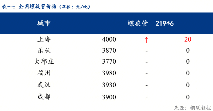 今日主流城市螺旋管价格趋强。截至发稿,219*6mm上海地区报4000元/吨,较上一交易日上涨20元/吨;乐从地区报3870元/吨,较上一交易日持平;大邱庄地区报3770元/吨,较上一交易日持平。