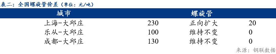 今日螺旋管南北价差小幅波动 ,华东区域与华北区域价差为230元/吨,华南与华北价差为100元/吨,西南与华北价差为130元/吨。