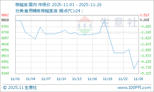 据生意社商品行情分析系统显示:11月国内棕榈油行情弱势运行,振荡下跌,跌幅超3%。11月1日,棕榈油市场均价8818元/吨,11月26日,棕榈油市场均价8470元/吨,下跌3.95%。