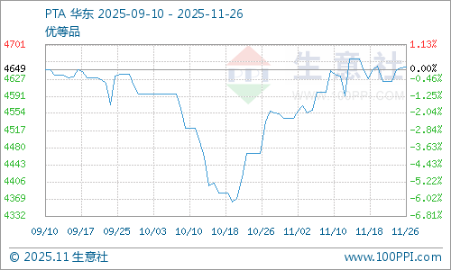 据生意社商品行情分析系统,近期国内PTA市场行情僵持整理,处于近2个月较高位置。截止11月26日国内华东地区PTA现货价格在4654元/吨,较11月10日上涨0.20%。