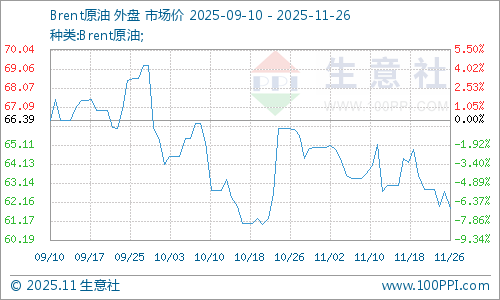 从成本端来看,欧佩克+新一轮增产,市场依然担忧长线的供应过剩风险,地区局势有所缓和,加之美国需求减弱,美国关税问题拖累全球经济和需求预期,导致国际油价行情下滑。截止11月25日,美国WTI原油期货1月合约结算价报57.95美元/桶,跌幅0.89美元或1.5%。布伦特原油期货2月合约结算价报61.80美元/桶,跌幅0.92美元或1.5%。