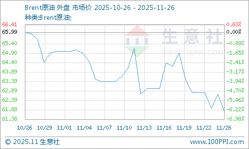 原油市场,欧佩克+新一轮增产,市场依然担忧长线的供应过剩风险,地区局势有所缓和,加之美国需求减弱,美国关税问题拖累全球经济和需求预期,导致国际油价行情小幅下滑。截止11月25日,美国WTI原油期货1月合约结算价报57.95美元/桶,跌幅0.89美元或1.5%。布伦特原油期货2月合约结算价报61.80美元/桶,跌幅0.92美元或1.5%。