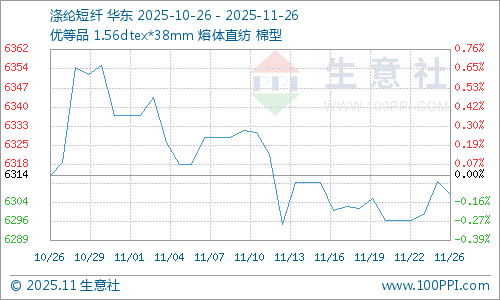 据生意社商品行情分析系统,近期国内涤纶短纤价格震荡盘整,截止11月26日涤纶短纤(1.4D*38mm)市场均价在6306元/吨,较11月13日上涨0.18%。