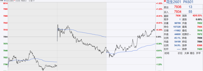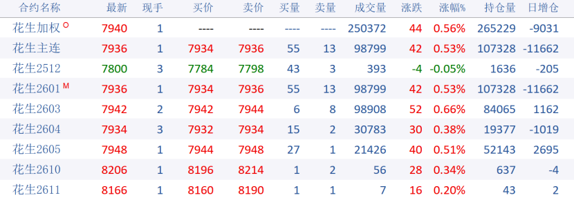 花生期货7个合约,当日全天各合约涨幅不一,品种持仓265229手,较上一交易日减少9031手。
