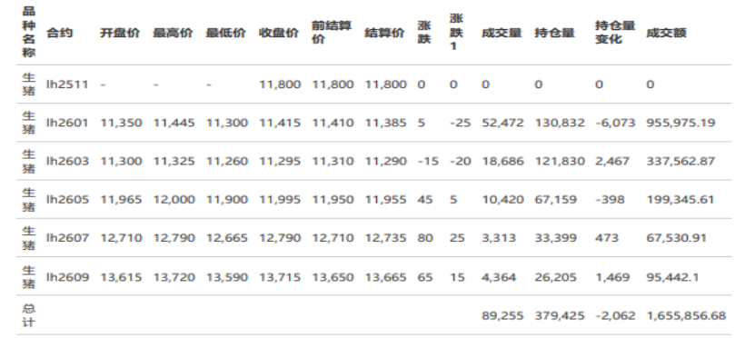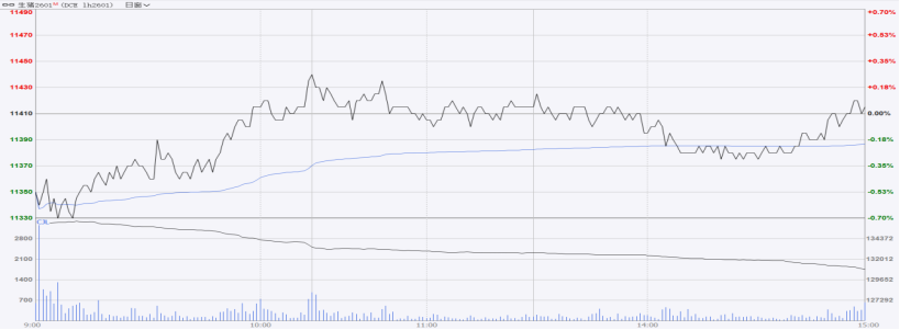 当日(20251125),期货品种生猪lh2601合约呈现震荡上涨走势,当日收至11415点,较昨日结算价上涨0.04%,全日成交5.25万手,持仓量13.08万手。