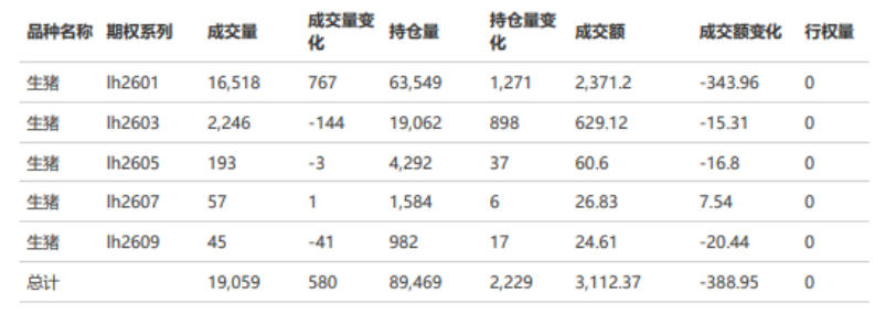 生猪期权全日成交19059手,总持仓89469手,持仓量增加2229手,当日合计行权0手。