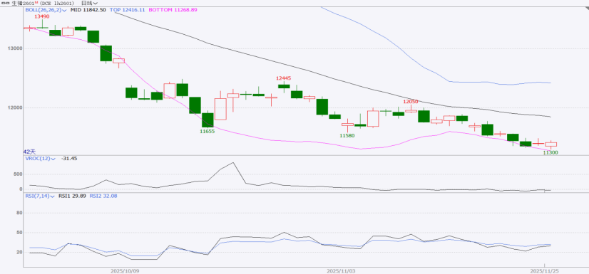 期货品种生猪lh2601当日日线收阳线,日内短暂上涨,K线处于BOLL线下轨附近,BOLL线呈现开口状态。