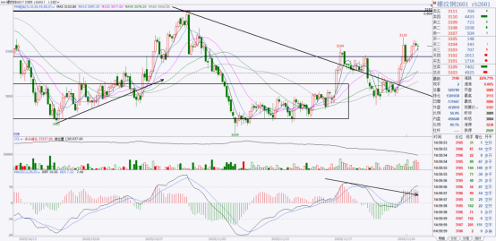 期货品种螺纹钢rb2601合约,日线再次收阳,小时级别K线再次进入上方震荡区间,均线呈现向上发散态势,同时,MACD红柱暂未有明显缩短迹象,短期技术指标表现良好。